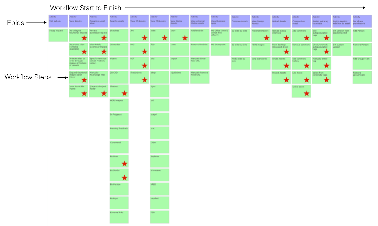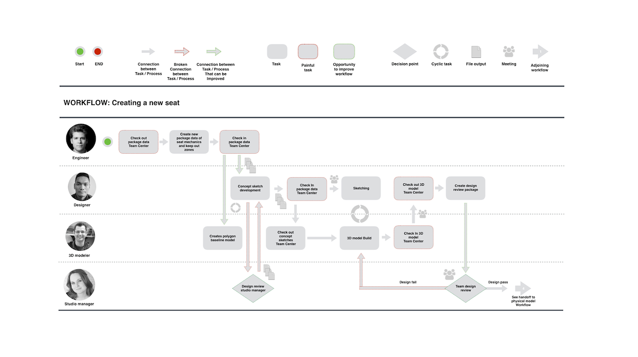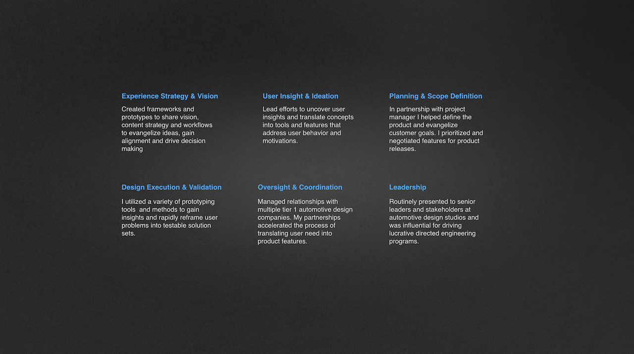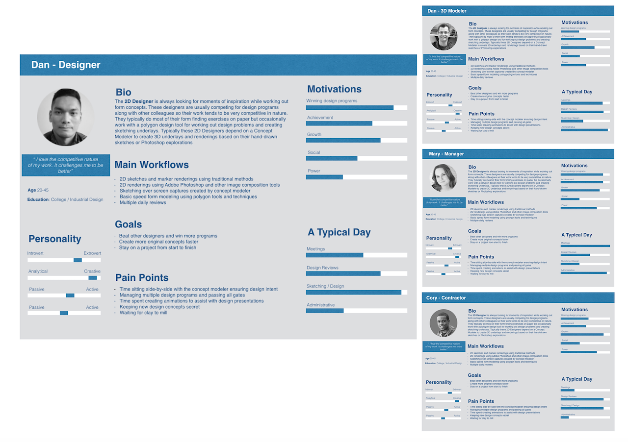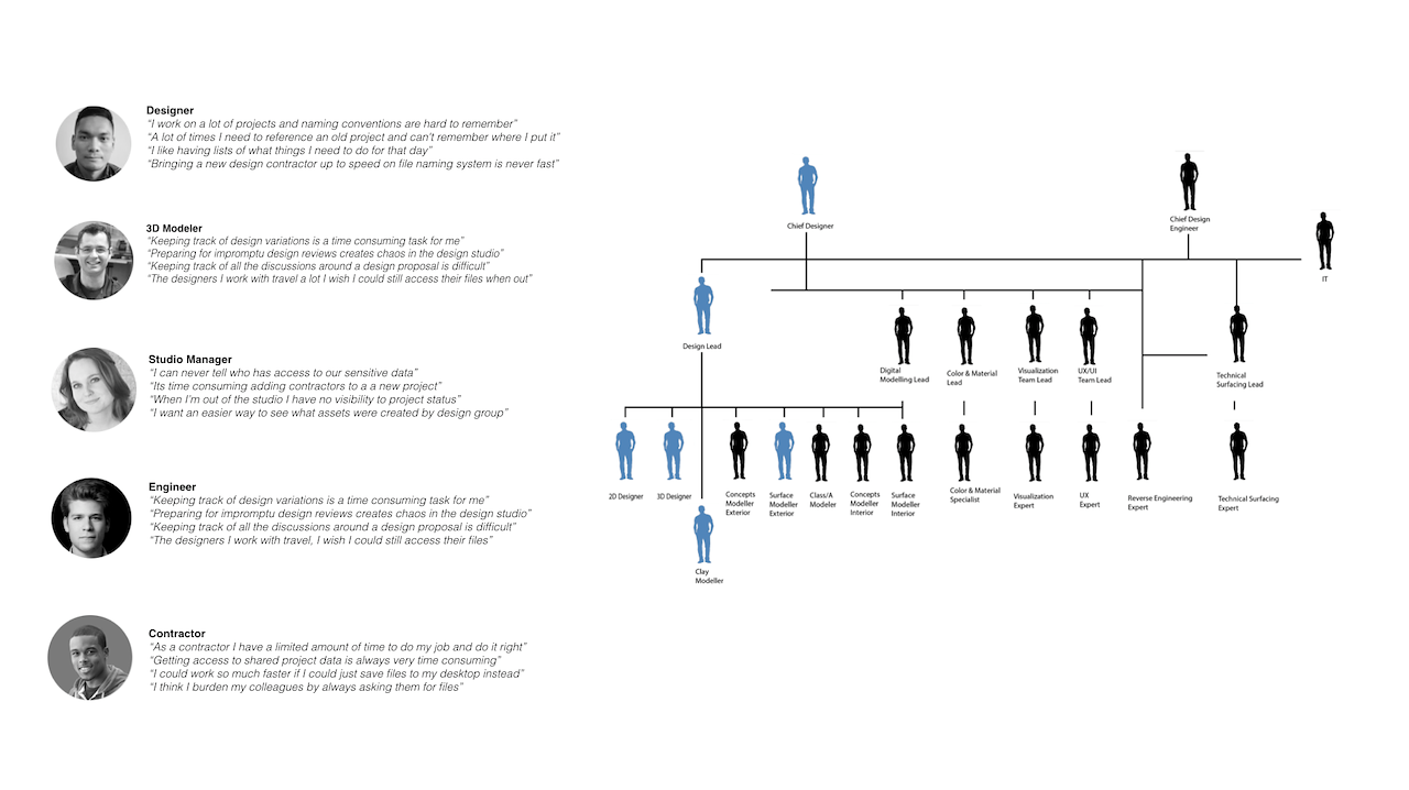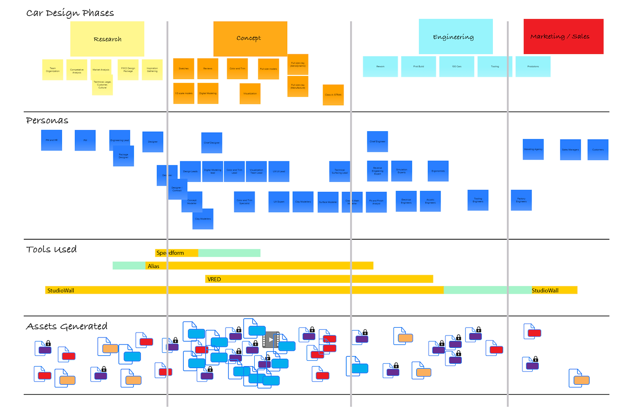 To create exceptional user experiences we need to thoroughly understand our users' challenges, pain points, and motivations.Through this highly detailed process, I identified various stages in the Automotive workflow – from Research to Concept to Engineering to sales. Once the workflows were outlined, I added the personas involved throughout the process.This view gave new perspective into the depth and breadth of the Automotive business.