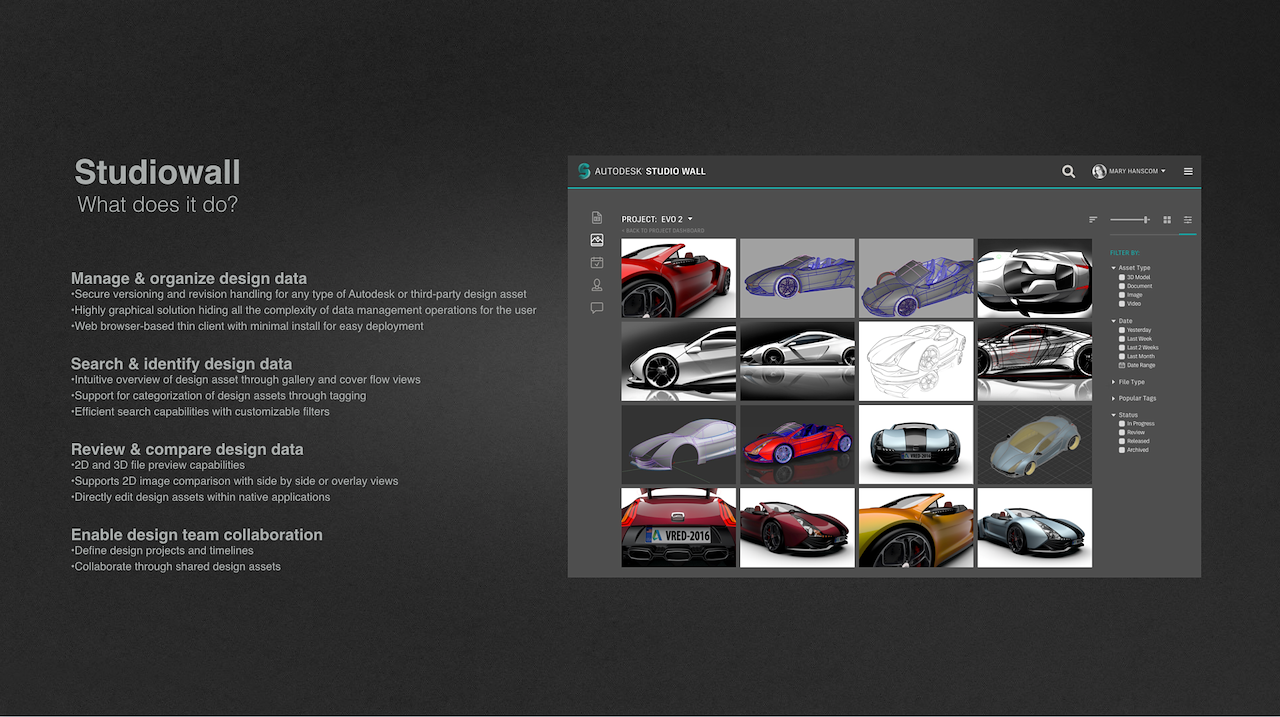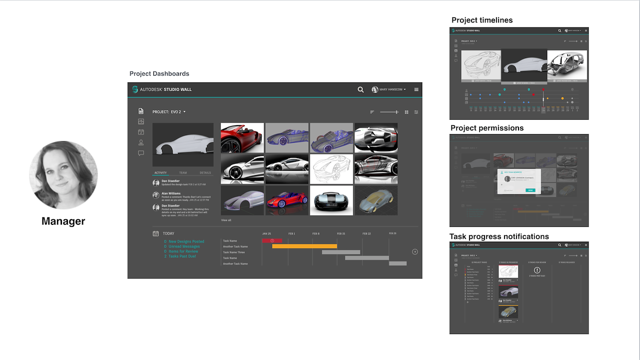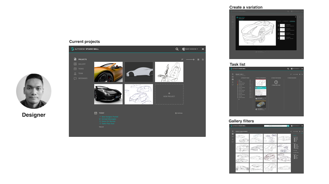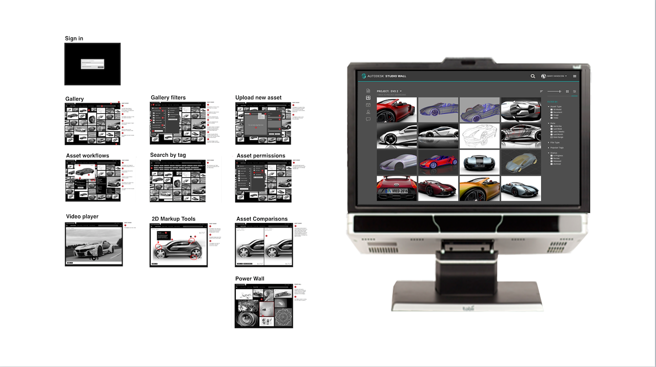 As a lead UX designer for Autodesk automotive, I played an integral part in developing strategic working relationships with designers and leadership from several major major automotive companies. Throughout the development of StudioWall, I frequently validated new workflows and tools with automotive design studios