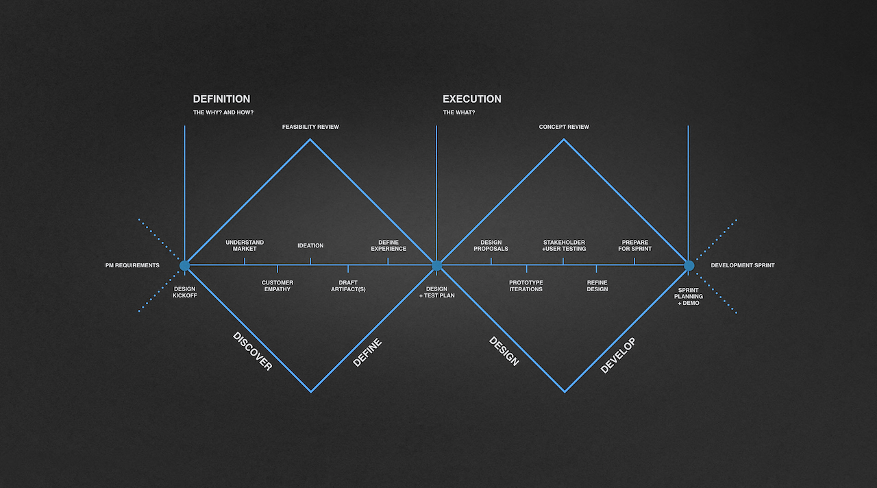 Each two-week design sprint followed a double diamond approach. To ensure that no development bottleneck was created the UX team worked two weeks ahead of development teams