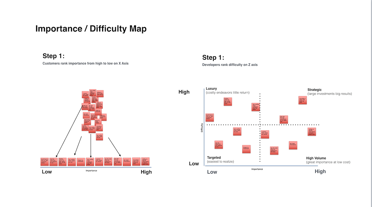 To identify customer desires, I instructed them to rank the importance of application functionality from high to low on the X-axis. To understand development complexity I asked each developer to rank functionality complexity from low to high based on development difficulty on the Y-axis. The matrix was then divided into quadrants to identify luxury, strategic, targeted and high volume user experience categories