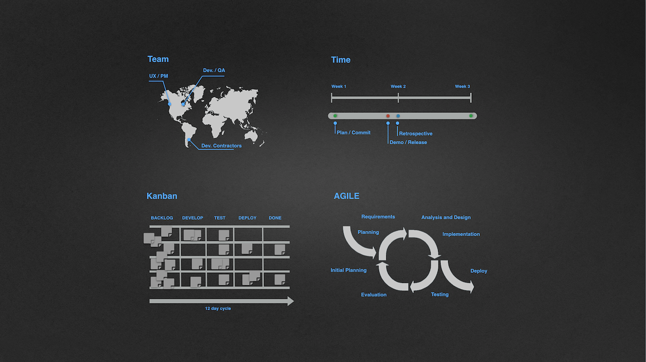Using Agile development methodologies and practices ensured synchronization of the entire team. Card sorting boards, Wiki documentation, and backlogs were reviewed daily with the appropriate scrum and product owner teams