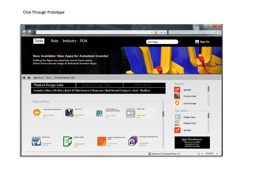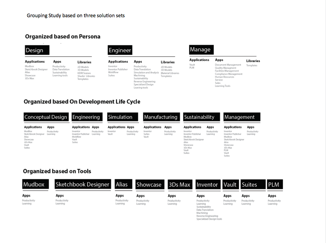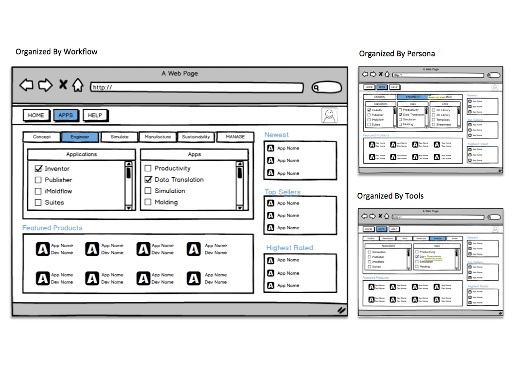 Early solutions sets explored three groupings based on tools, personas and workflows as the main categories for App filtering.